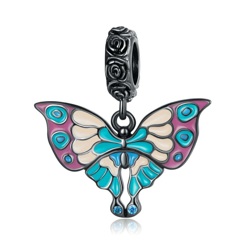 Art Butterfly and Black Rose Dangle Charm Silver