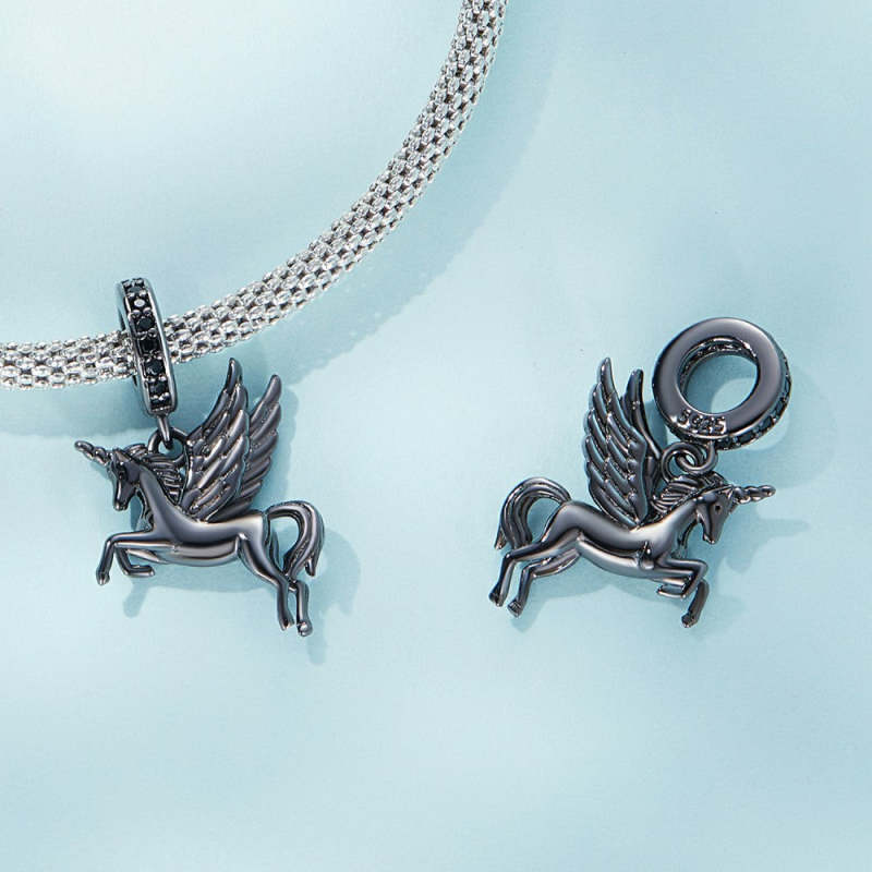 Black Flying Horse Dangle Charm Silver