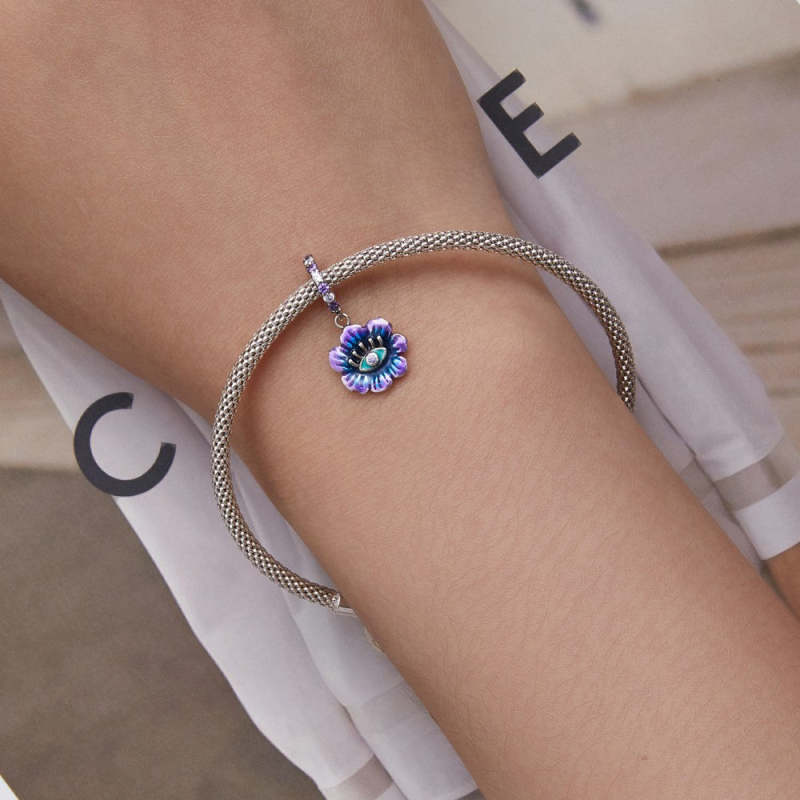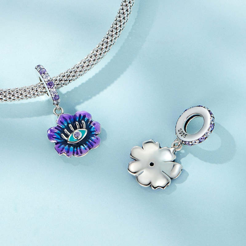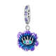 Blue and Purple Evil Eye Flower Dangle Charm Silver