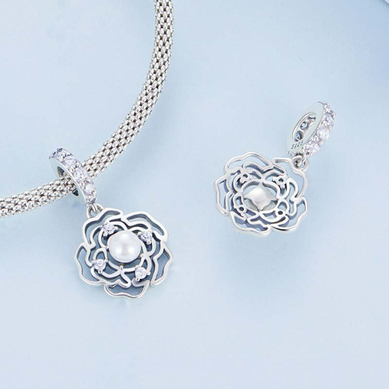 Camellia with Pearl Dangle Charm Silver