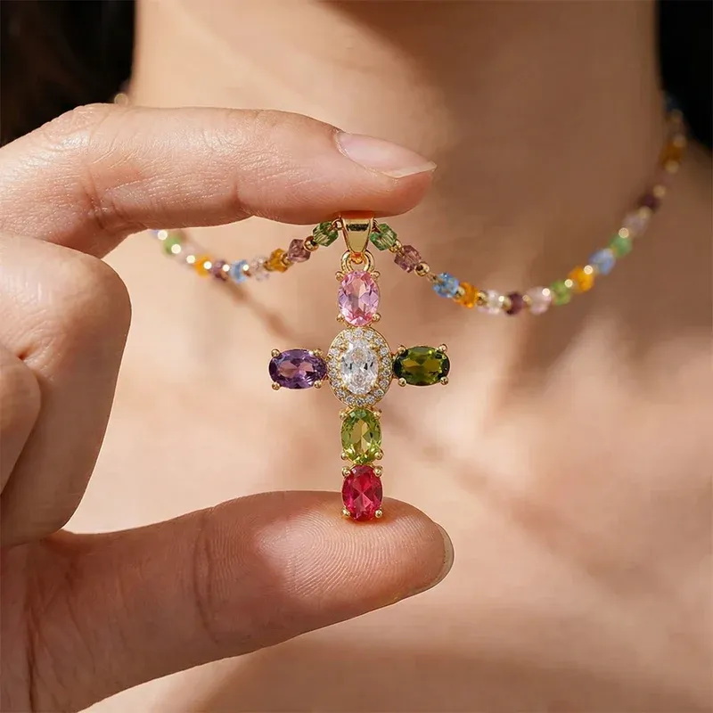 This Colorful Cross Pendant Necklace features a vibrant design adorned with sparkling zircon stones, creating a bold yet elegant statement piece. The multicolor accents add a modern twist to the classic cross shape, making it both meaningful and stylish.