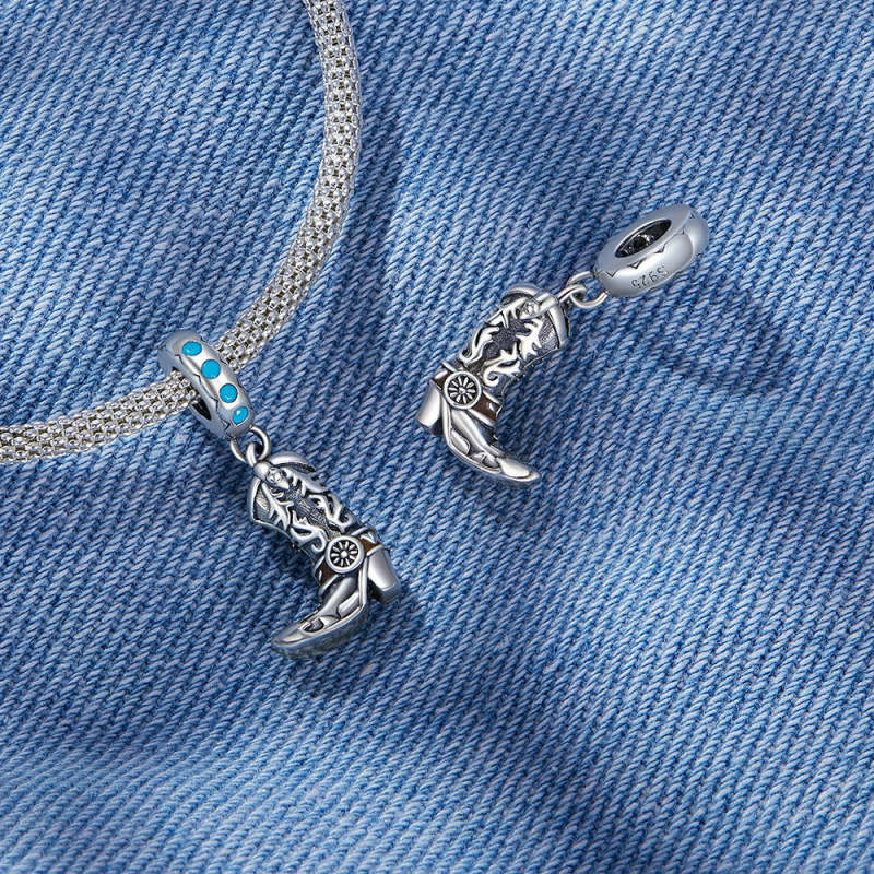 Cowboy Leather Boots Dangle Charm Silver
