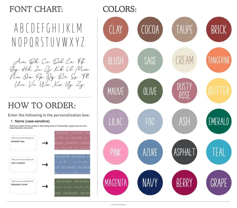 • Custom name printed with alternating lines of all-caps font text and case-sensitive script font