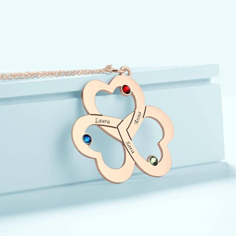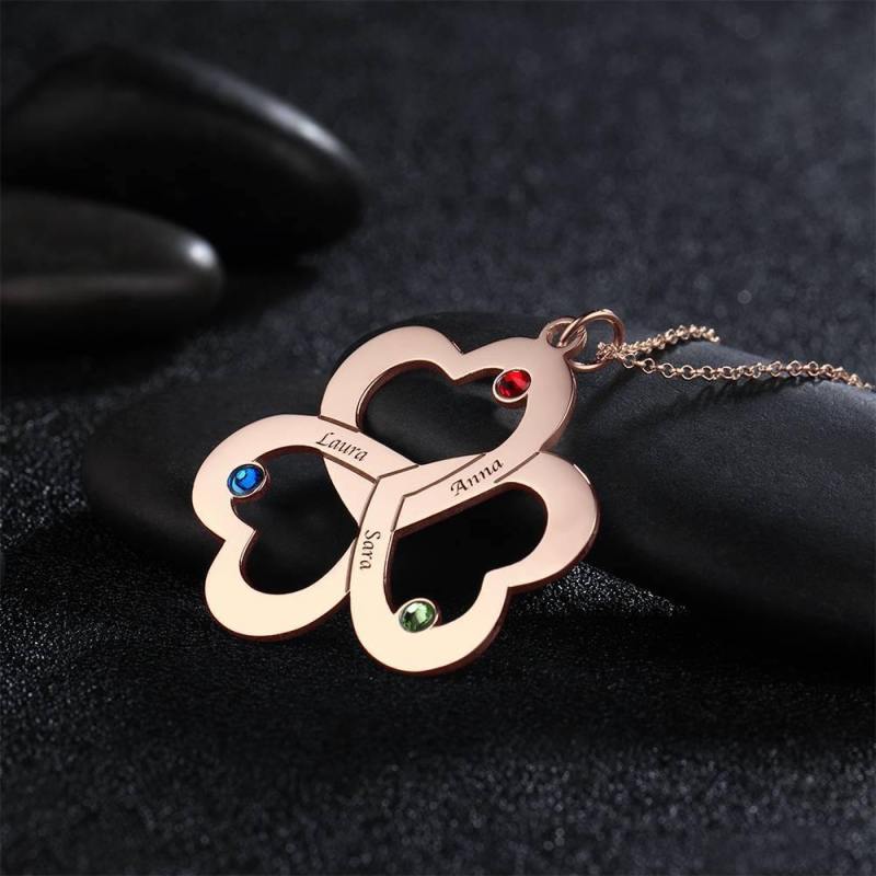 Custom Birthstone Necklace with Engraving, Three Heart Necklace Rose Gold Plated - Silver