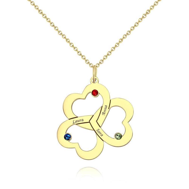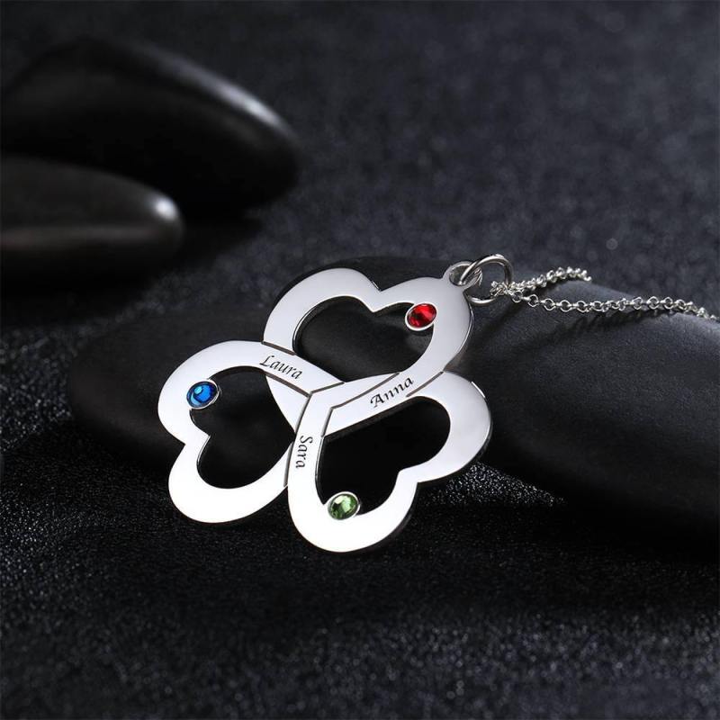 Custom Birthstone Necklace with Engraving, Three Heart Necklace Silver