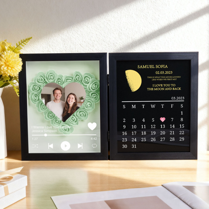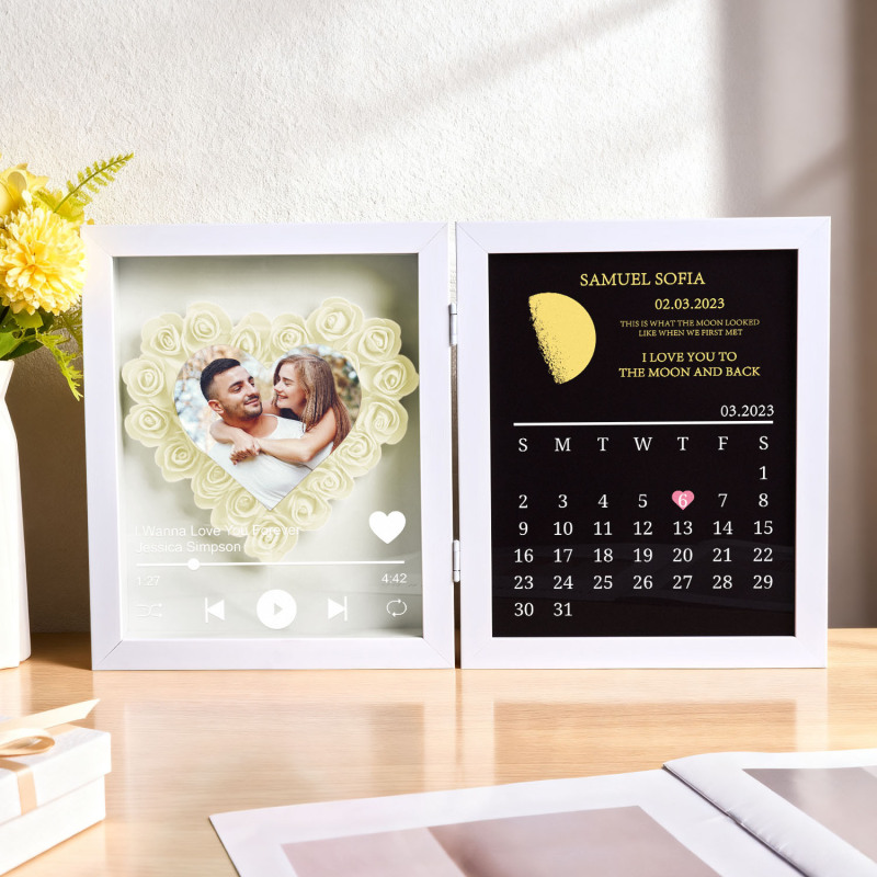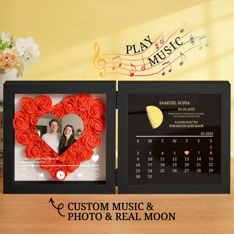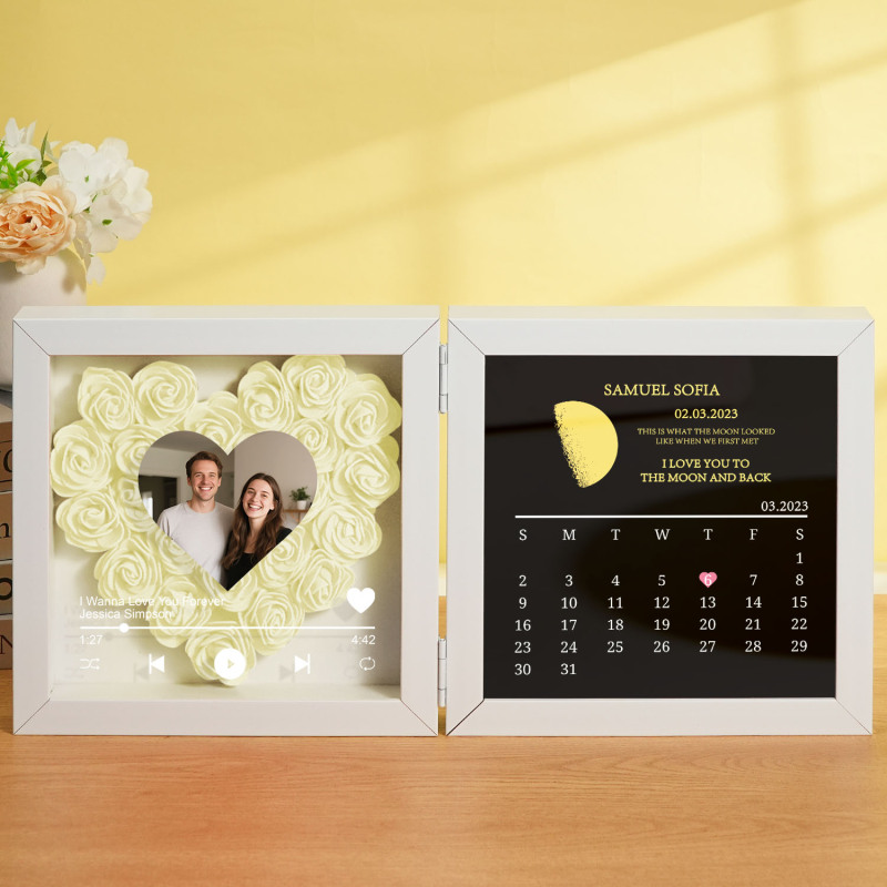Introducing our Custom Music Flowers Shadow Box with Real Moon Phase Anniversary Calendar-a breathtaking fusion of handmade floral art, celestial romance, and personalized melody. This unique frame allows you to forever capture the moon from a special night-your first kiss, proposal, wedding, or any unforgettable moment-along with a song that tells your story.