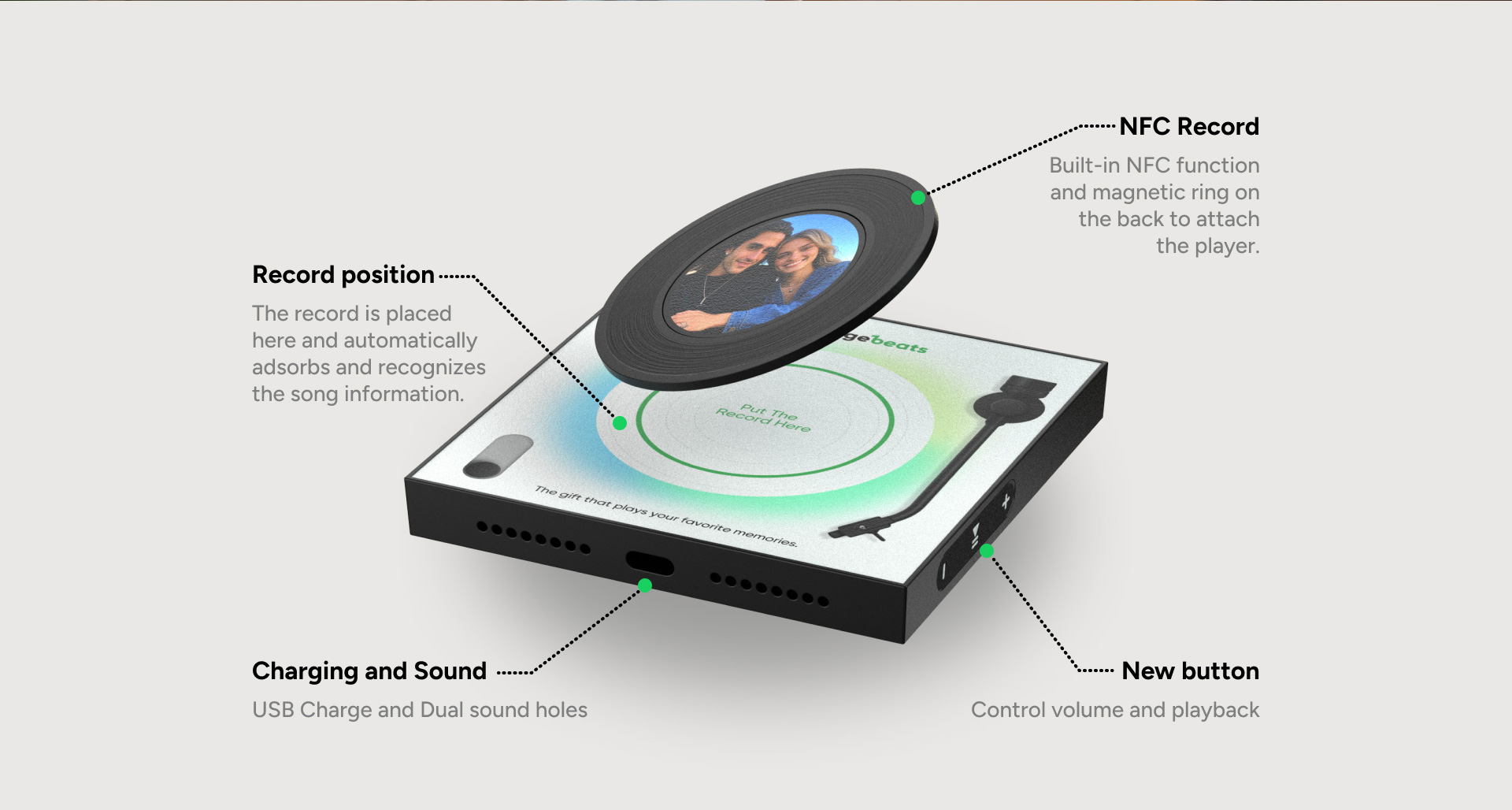 NFC recognition for instant music playback.