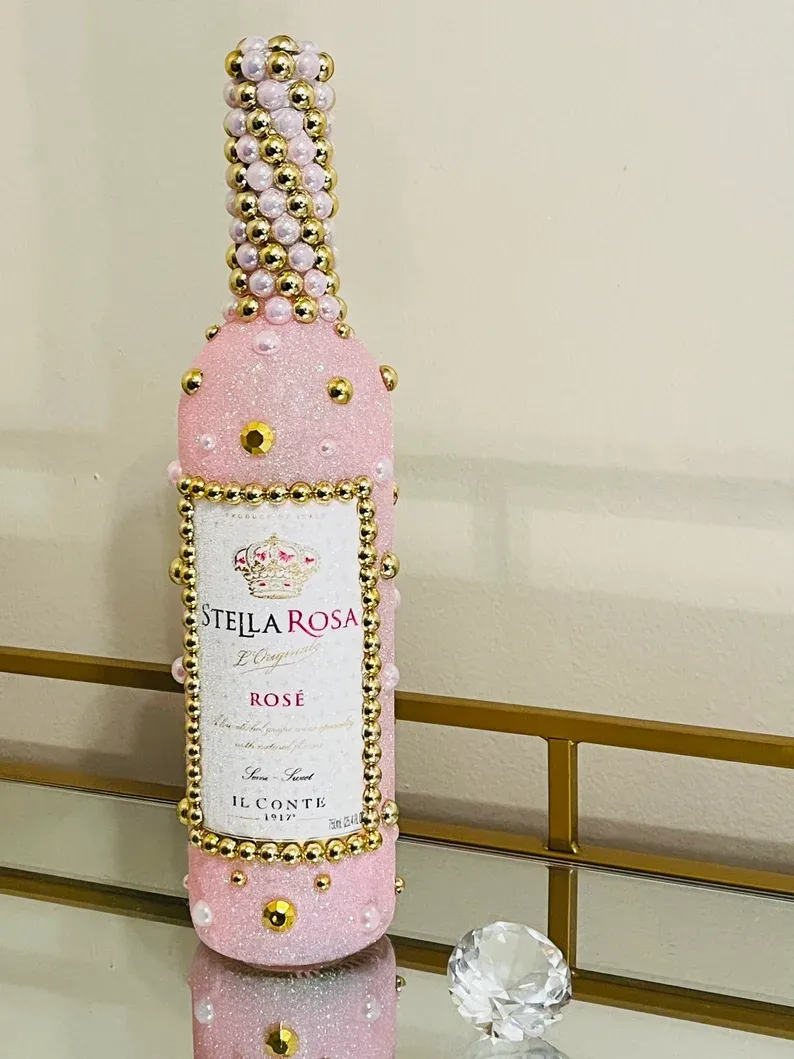 Beautiful hand decorated bottle with sparkling iridescent pink ice glitter. Iridescent pink pearl around the label border. Stunning iridescent pink and white pearl detail on the neck. Finished with a pink glitter bow.