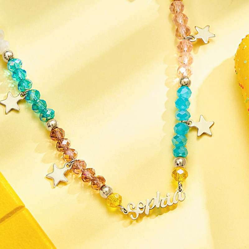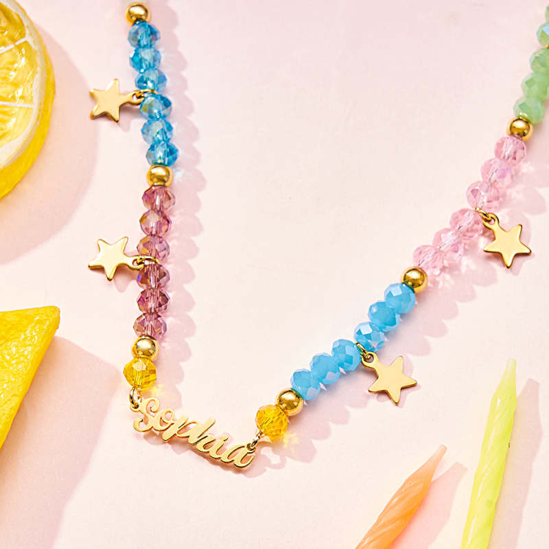 Whether they're headed to the beach, a playdate, or a summer party, our Custom Name Necklace is sure to make a statement and showcase their unique style. It's lightweight, comfortable to wear, and easy to layer with other necklaces for a trendy look.