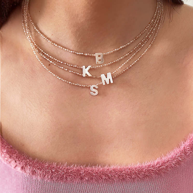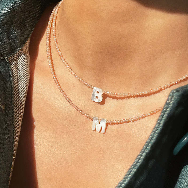 This initial necklace is an elegant way to show your uniqueness and style. Handcrafted with genuine mother of pearl letter beads, it's the perfect gift for any special occasion. The initial letter is surrounded by champagne beads, adding a touch of luck and blessings. Remind yourself of what an awesome person you are with this meaningful and minimalist necklace.