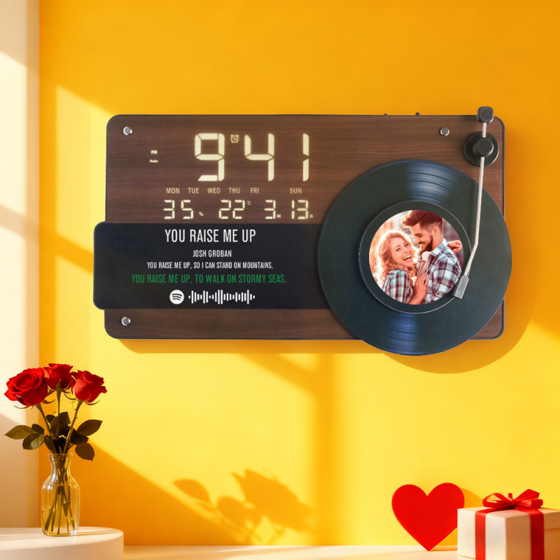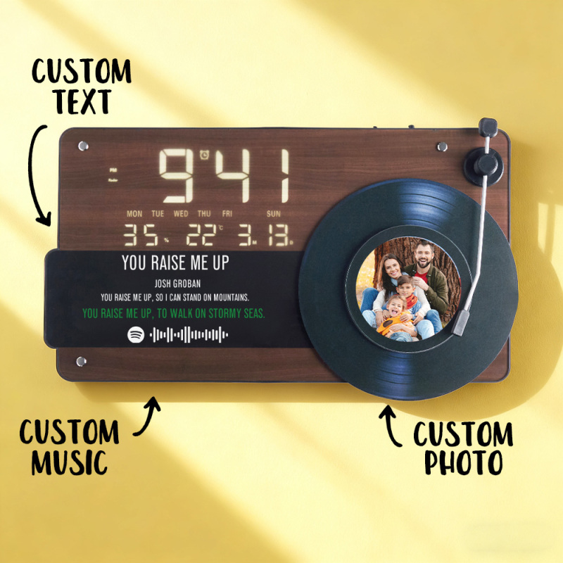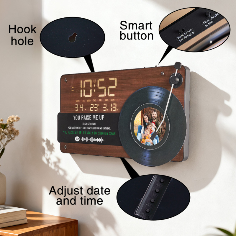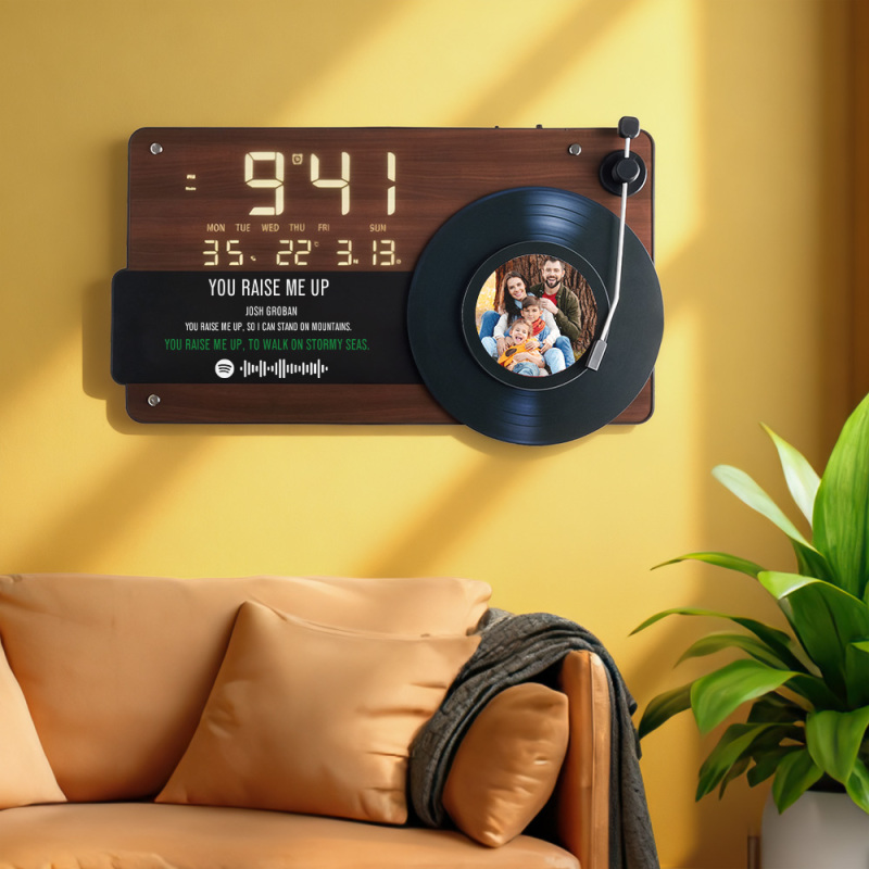 Elevate your living room decor with this Retro Custom Photo Lyrics Vinyl Record Electronic Clock! Blending nostalgic vinyl charm with personalized flair, it lets you showcase beloved photos, meaningful song lyrics, and functions as a reliable wall clock—perfect as a decorative painting and a heartfelt gift for family. Add a unique, warm touch to your home while keeping track of time; ideal for those seeking both style and sentiment in home decor.