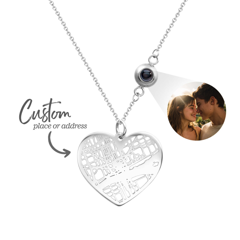 Capture memories in style with our Custom Photo Projection Necklace. This heartfelt piece features a discreet projection charm that displays a treasured photo when worn, turning everyday moments into a personal keepsake. The Cherished Spot Map design adds a meaningful touch by marking a special location, enhanced with a gemstone accent for a touch of elegance. Perfect as an Anniversary Gift or a thoughtful present for her, this necklace combines sentiment and sophistication.