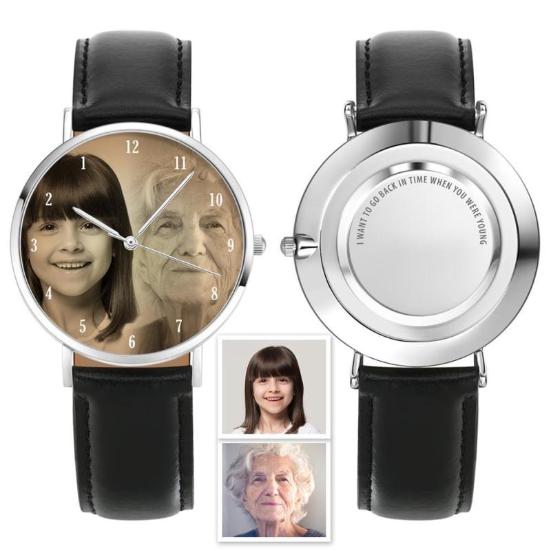 Year after year, time goes on and on. Even in old age, I still remember your childlike appearance. Carry your love, with one of our memorial watches. You may not be able to turn back the hands of time but this watch makes us think we can stay together.Upload two photos, young and old, becomes an eternal contrast and memory. Customize a special gift for the elderly.This is a magical and interesting watch.The pointer are backward.Counter clockwise pointer for people who like to be a bit different!Water Resistant, anti-freezing, anti-wear. and tightly sealed dial guarantees that your photo will not fade for 10 years.Easy customization, make your photo watch in minutes.