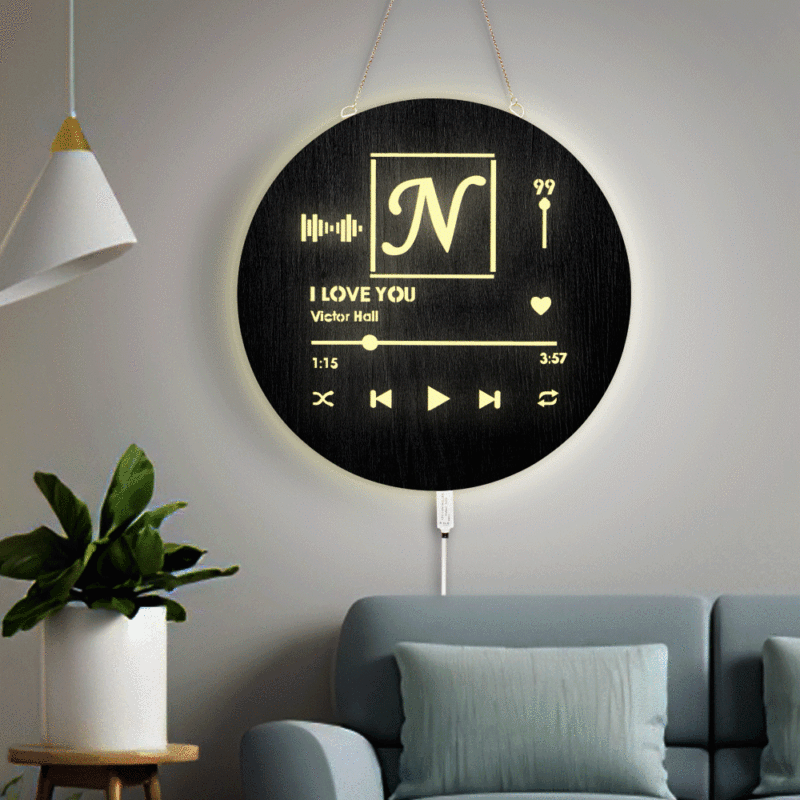 Personalized change 7 different color lights gift for Boys,Kids and Friends. You can hang it on the wall trough the holes in the back.For many occasions like Birthday party, Halloween, Christmas,Anniversary Dual function, perfect combination of wood and light. Minimalist Modern Style,exquisite workmanship, full of creative personality and visual arts,is the best gift for friends and family.You can engrave the spotify code of your favorite song on the acrylic music light so that you can scan the Spotify Code to listen to your favorite song anytime, anywhere.