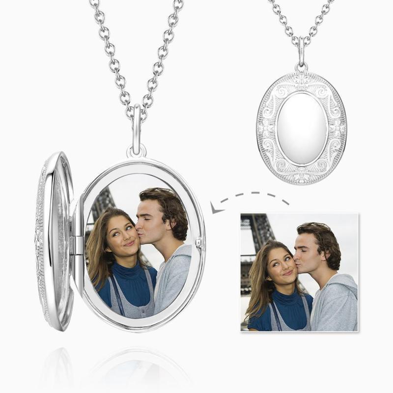Embossed Oval Photo Locket Necklace With Engraving Platinum Plated