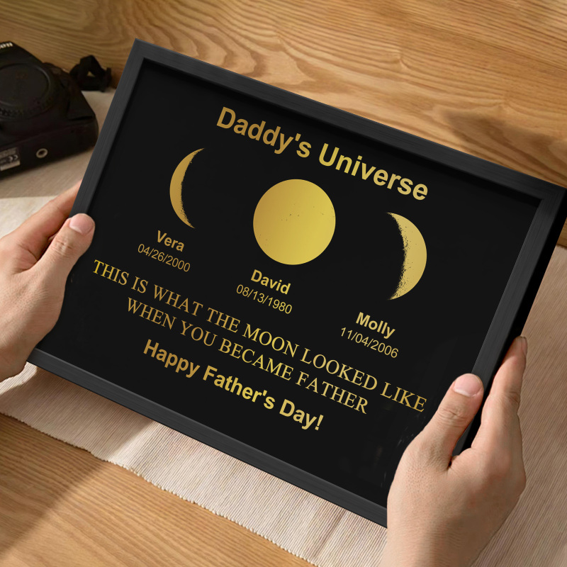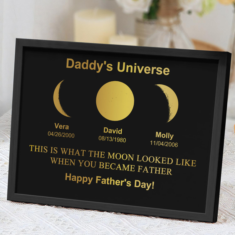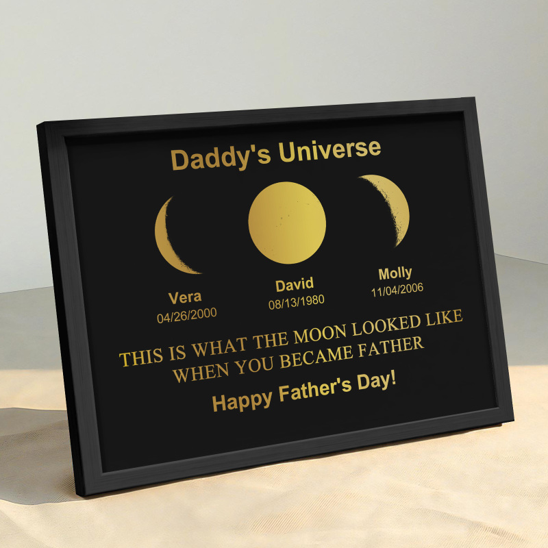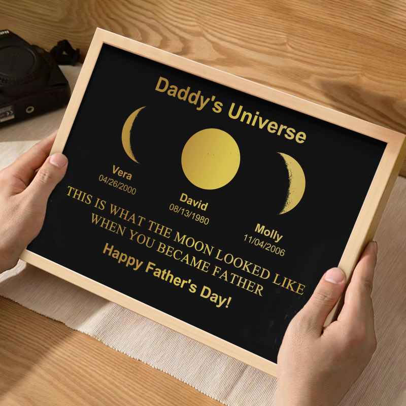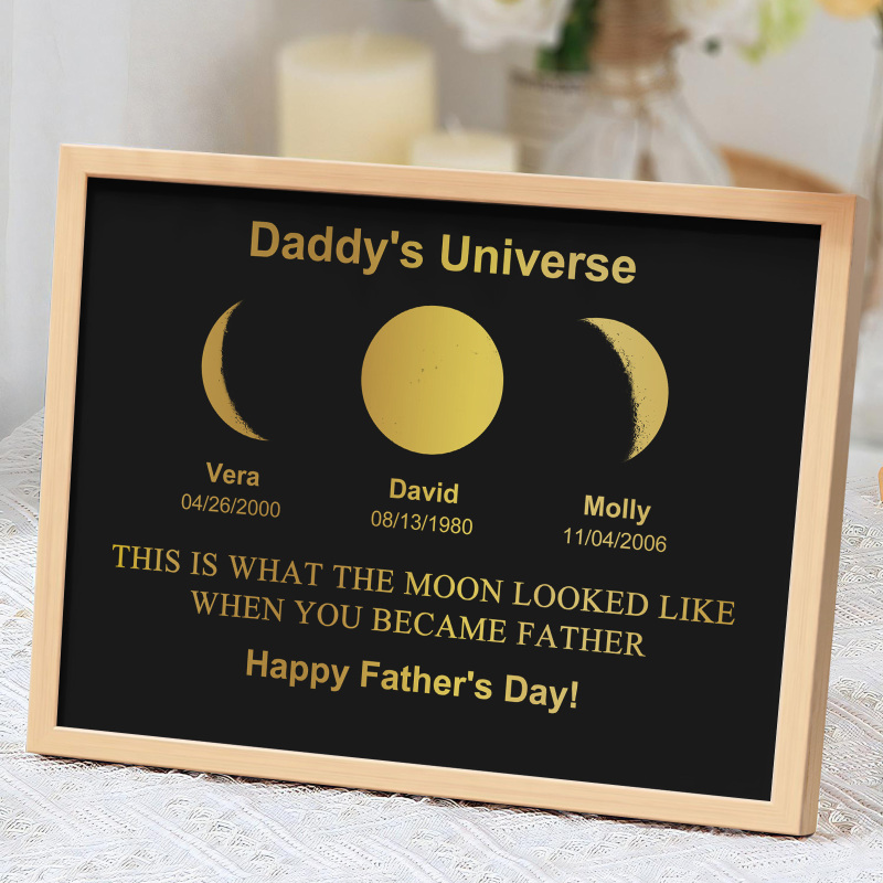 Explore the mesmerizing lunar cycles with our exclusive Daddy's Universe Art Frame. Delve into the enchanting dance of the moon,revealing eight unique phases each month. Encased in our exquisite frame, witness the celestial beauty of these phases.