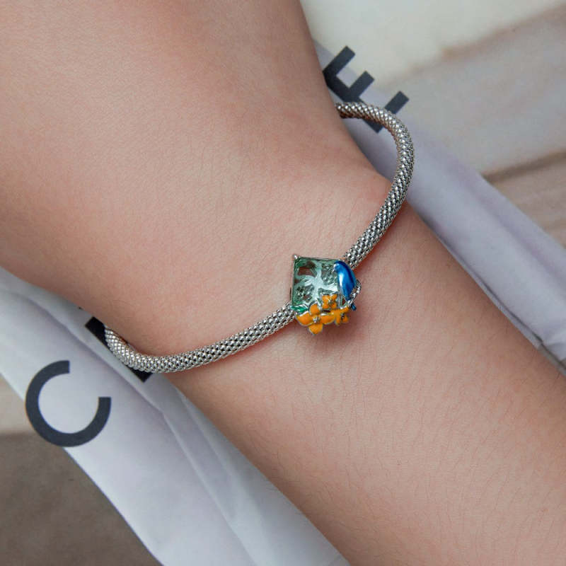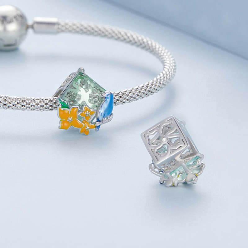 Flowers And Birds Blue Orange Charm Silver
