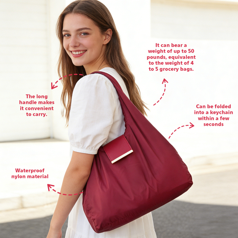 Made from lightweight, durable, eco-friendly fabric, it’s perfect for grocery runs, travel, daily shopping, and unexpected extra storage needs. When not in use, simply fold the tote back into its cute mini pouch - turning it into a stylish keychain accessory.