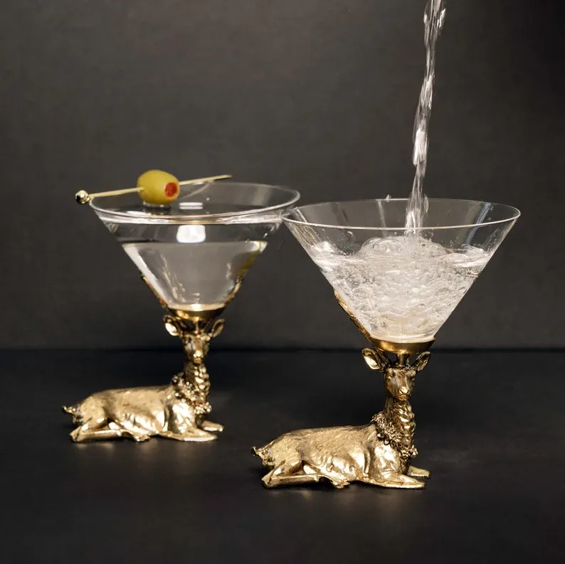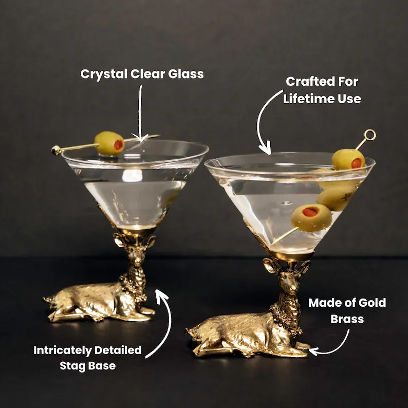 Introducing our exquisite Gold Stag Martini Glasses, designed with a touch of opulence and sophistication that is sure to captivate and delight. These stunning stemless martini glasses are the perfect choice for anyone seeking a unique and stylish addition to their collection.