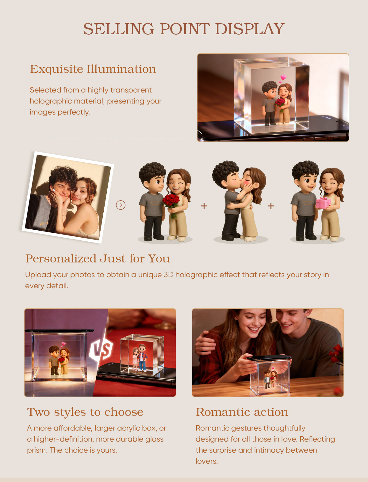 Upload your photos to obtain a unique 3D holographic effect that faithfully reflects your story in every detail.