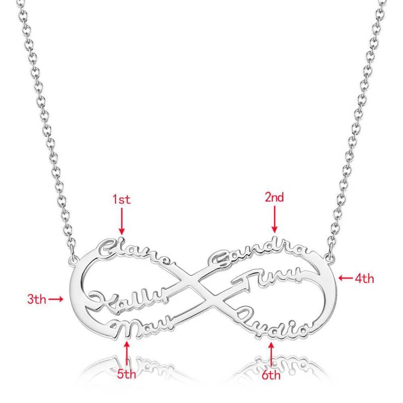 Name necklaces are a must for every fashionable woman. They have a fun and personalized feel to them. In addition, Soufeel name necklaces are versatile enough for everyday wear. Slip them on alone or layer them up for a bolder look. Depending on which style you get, you can customize Soufeel pieces with initials, one name, or two names. There are personalized infinity necklaces, retro nameplate necklaces, and modern bar necklaces. In addition to getting your own name, other options would be to get the name of a boyfriend, BFF, pet, parent, or even a favorite word that you use for inspiration. The meaning behind an infinity necklace is actually quite beautiful - it symbolizes eternity, empowerment, and everlasting love. The infinity symbol is the perfect expression of love that is simple in its design but is holds so much within its meaning. Our personalized Infinity necklace makes the most perfect gift for so many ocassions, weddings, birthdays or as the perfect staple in your own jewellery collection. Infinity Necklace with Six Names, Name Necklace Platinum Plated - Silver.