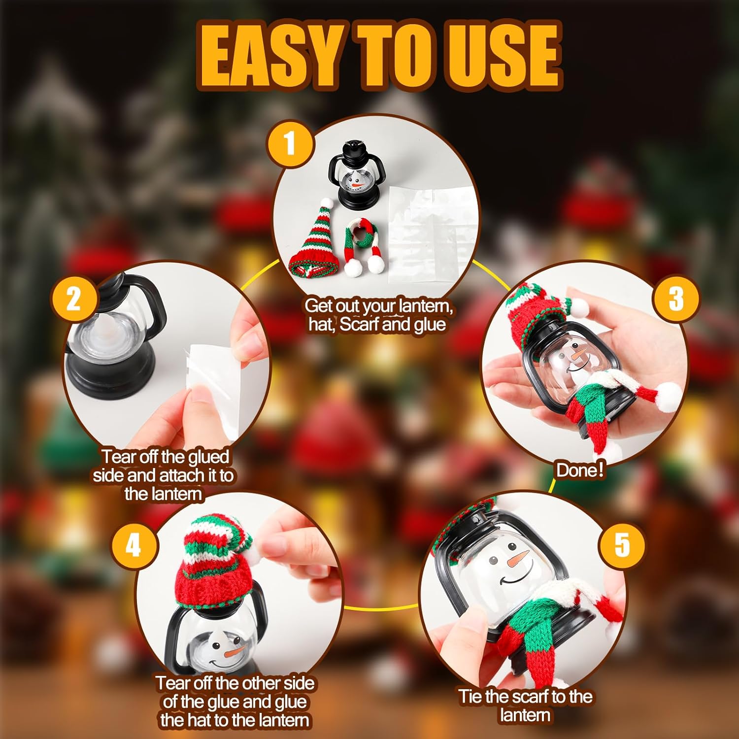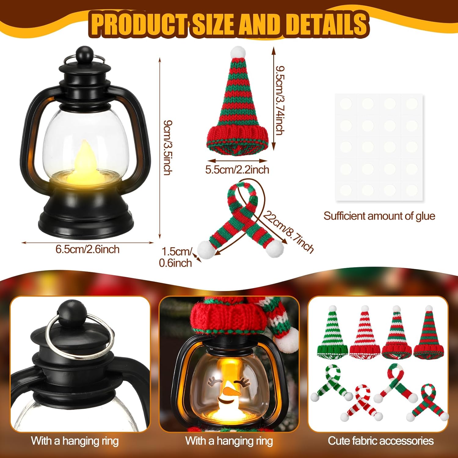 Ideal Size: Our Christmas mini lantern decoration measures approximately 6.5 x 9 cm, cute and easy to carry, without taking up too much space; The size of the Christmas hat is 9.5 x 5.5 cm, and the size of the scarf is 22 x 1.5 cm; The overall combination is harmonious and cute, and no matter where it is placed, it can make people see your decoration at a glance