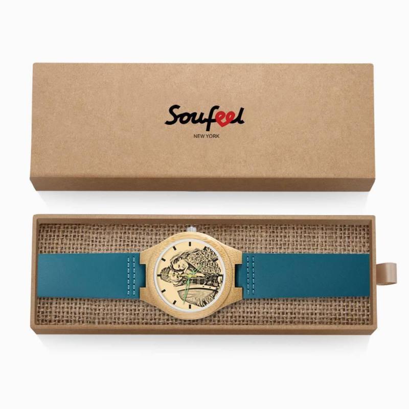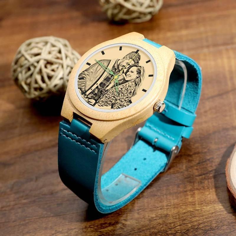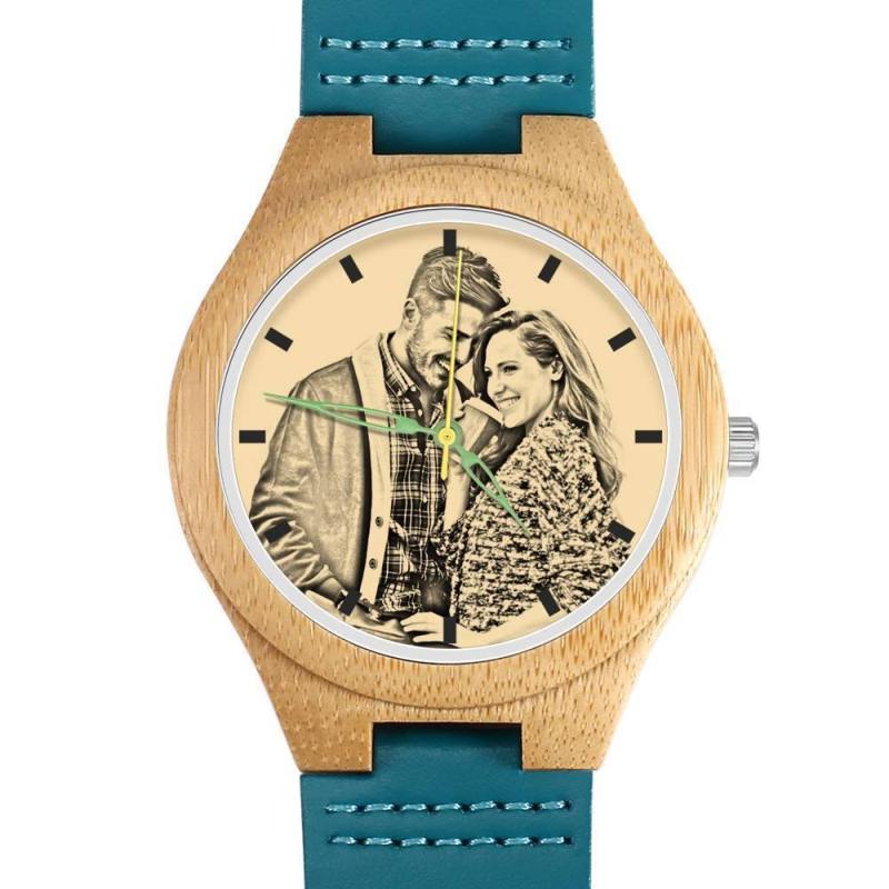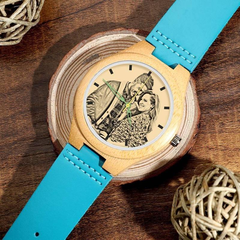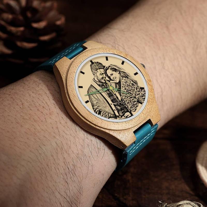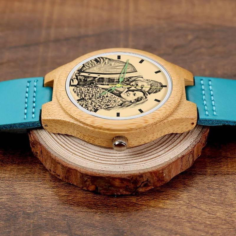 Men's Engraved Wooden Photo Watch Blue Leather Strap - Bamboo