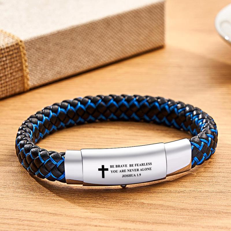 Crafted with precision and artistry, our Men's Inspirational Mantra Engraved Handmade Blue Braided Leather Cuff Bangle Bracelet is the epitome of sophistication. Made from high-quality leather, this adjustable bracelet boasts a stylish blue braided design. With its engraved mantra, this bracelet serves as a meaningful and elegant gift, reflecting a man's impeccable taste.