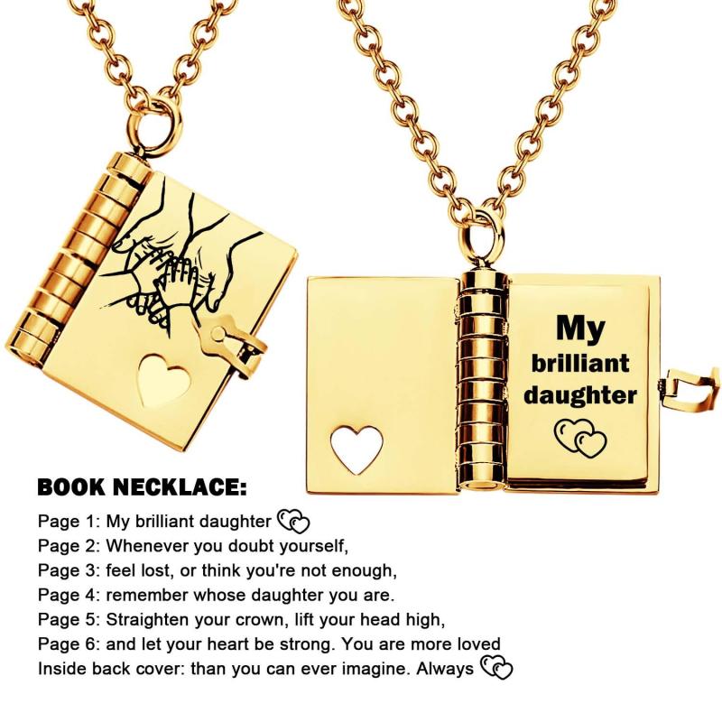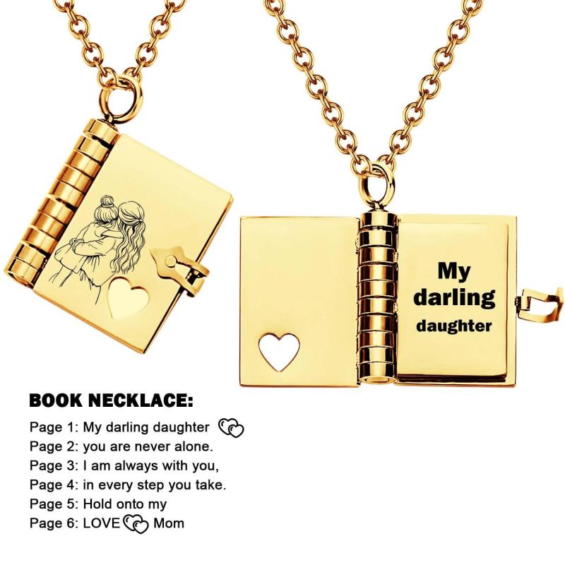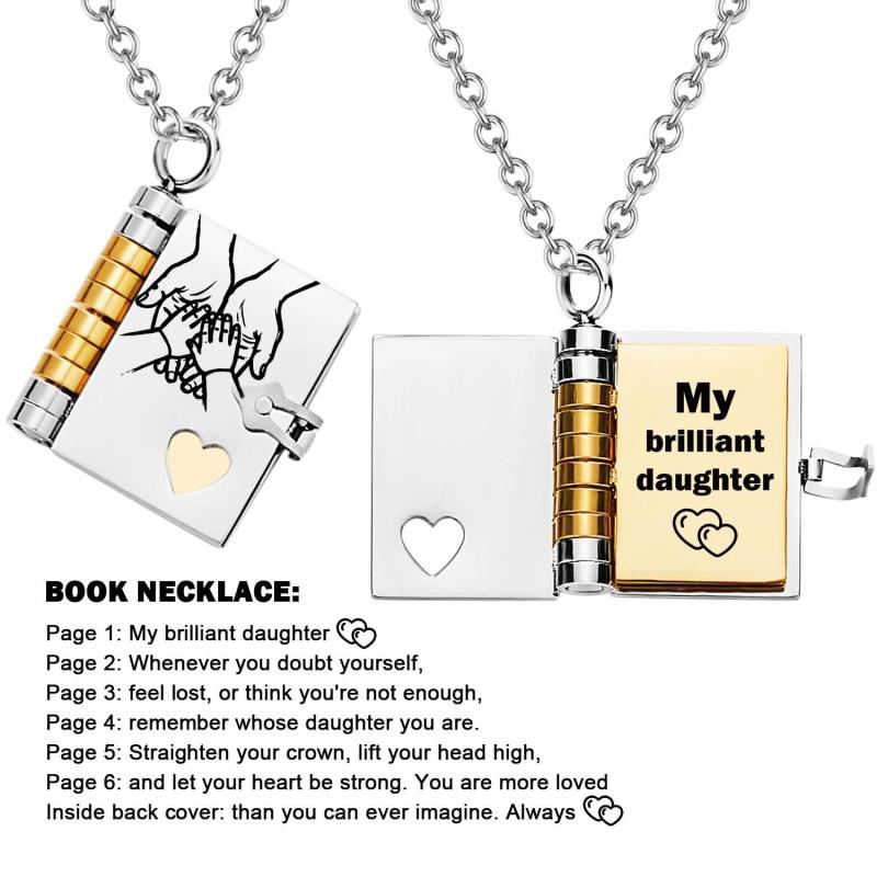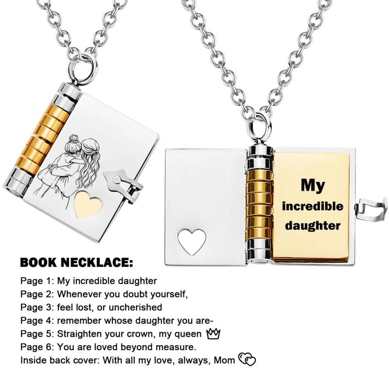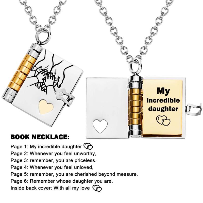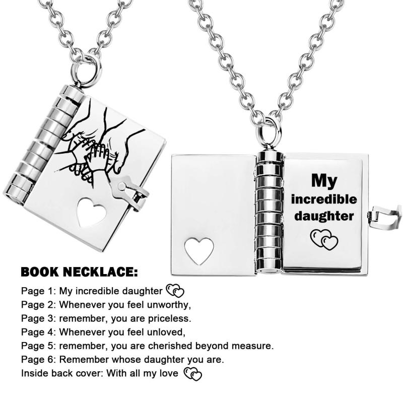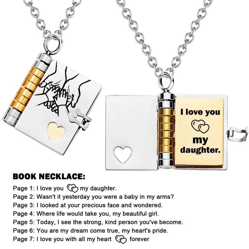 Celebrate the unique and loving relationship between you and your daughter with this stunning book-shaped pendant necklace. Expertly crafted from high-quality stainless steel, this necklace is both beautiful and durable, designed to last through all of life's moments.
