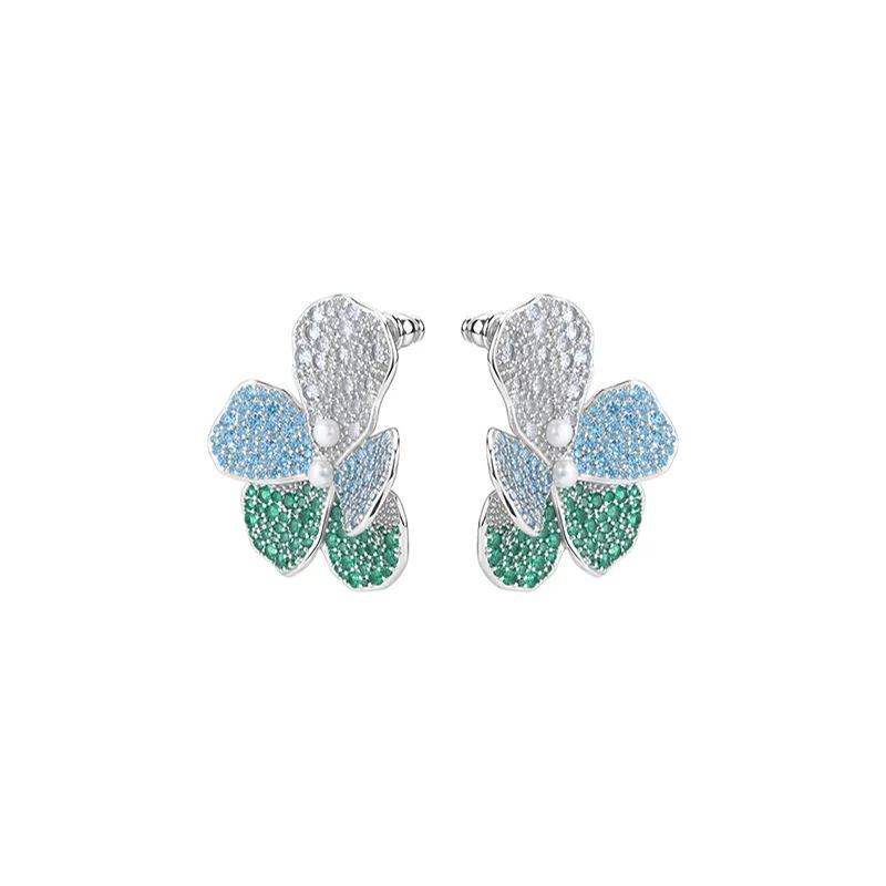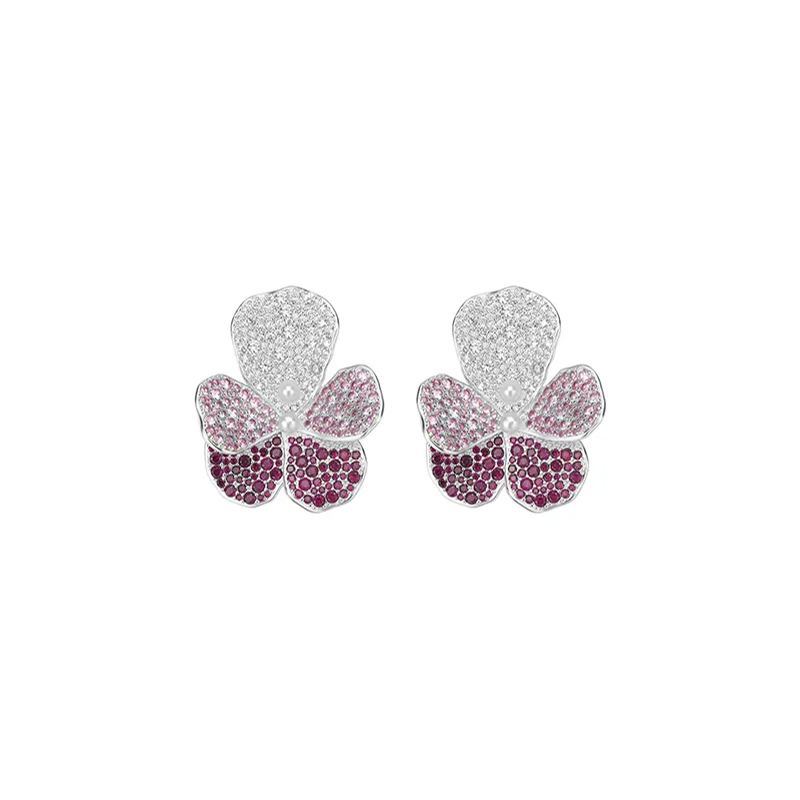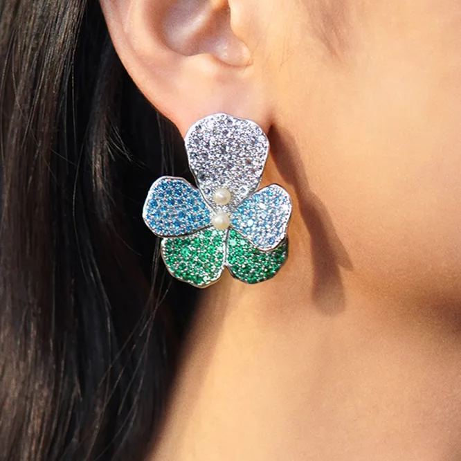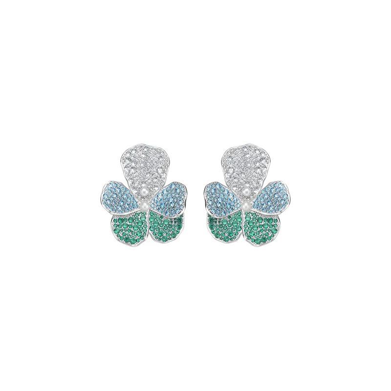 The product is made of rhodium-plated brass, metal bright polishing process, pansy flower shape, three-color gradient inlaid with zircon and freshwater pearls. The sparkling gradient color is easy to match with clothing.