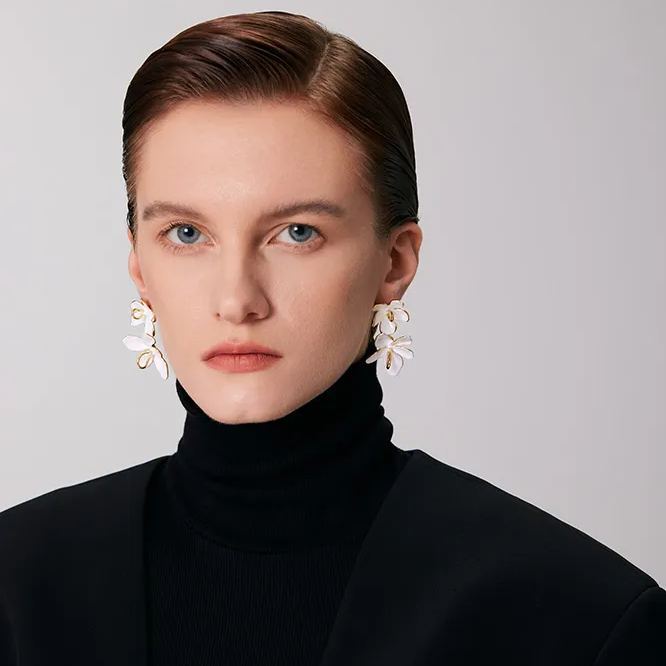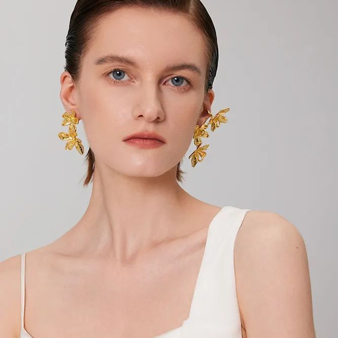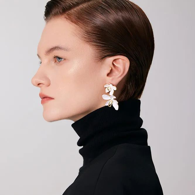 This pair of earrings adopts the realistic shape of peach blossoms, which is smart and elegant. The pistils are simplified into simple geometric lines, making them suitable for daily wear.