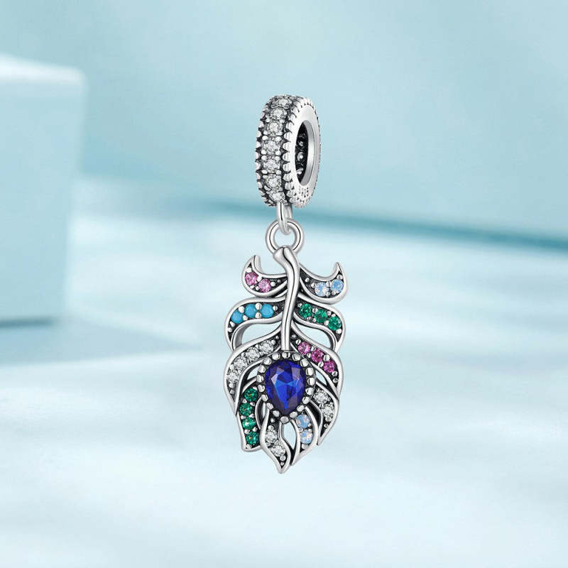 Peacock Feathers Dangle Charm Silver