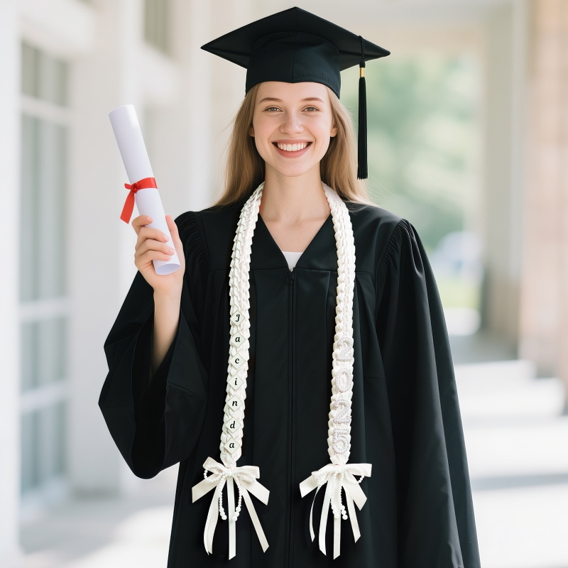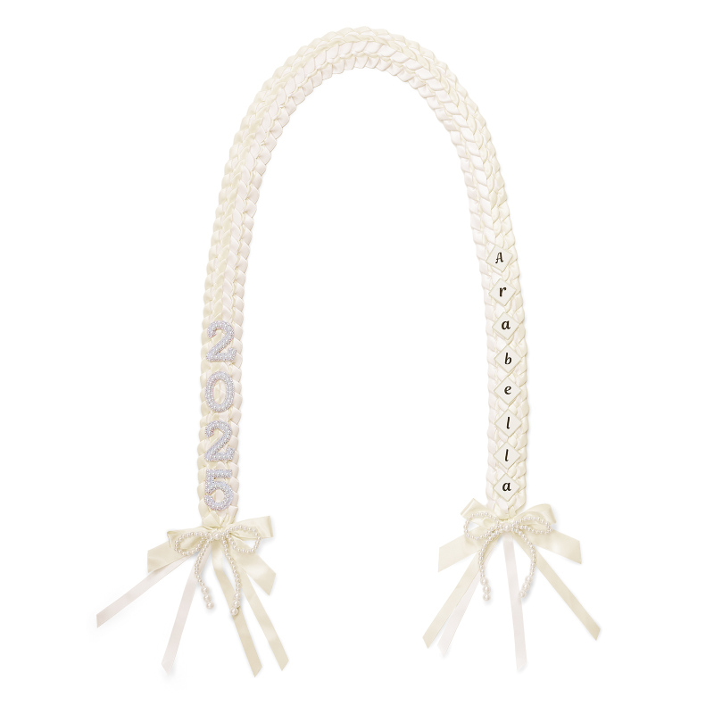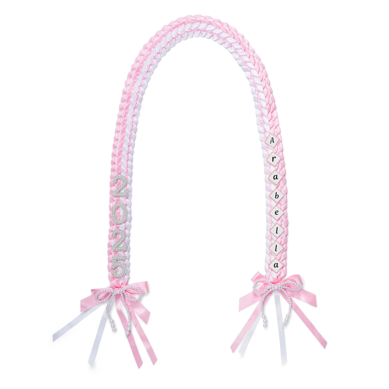Celebrate your graduation with our handmade Graduation Lei. Crafted with care using 1 1/2-inch satin ribbon this colorful lei is available in two stunning colors. The lei also comes adorned with the wording "2025" with pearls and your name that adds a touch of festivity to your big day This delightful lei is a perfect way to honor your hard work and dedication as you graduate. Wear it around your neck or give it as a gift to someone special who deserves the recognition for their outstanding achievements.