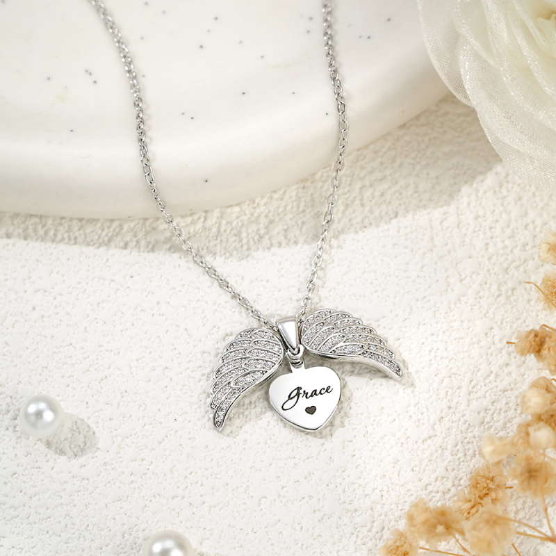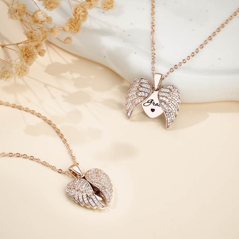 This necklace beautifully embodies the angelic essence with two intricately designed wings that open to reveal a delicate heart inside.