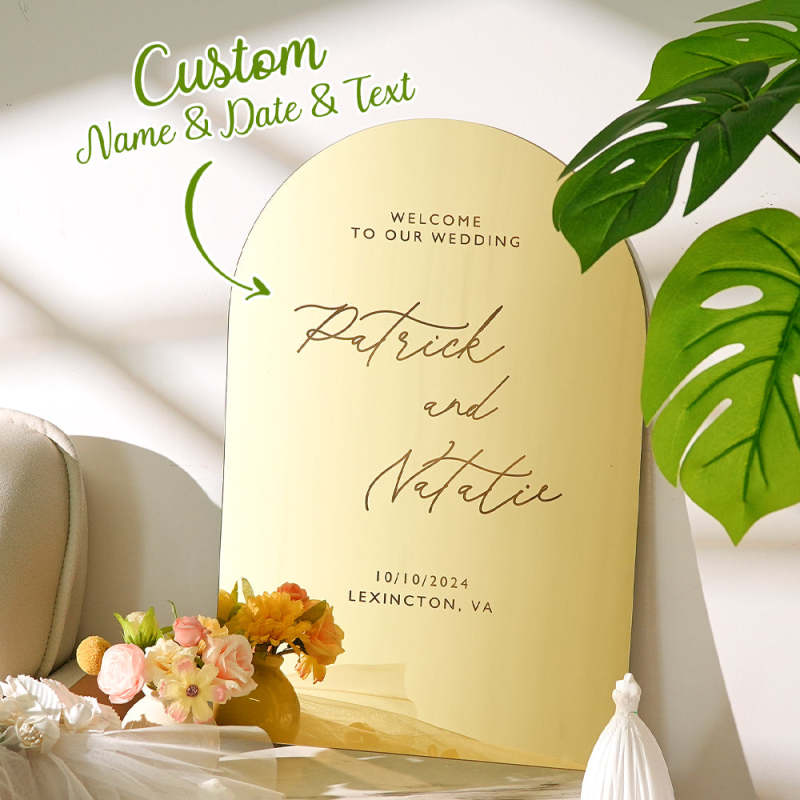 Make a lasting impression at your wedding with our Personalized Arched Wedding Sign. Crafted in gold mirror, this elegant sign adds a touch of sophistication to your special day. The personalized design welcomes your guests and makes a great keepsake gift. A must-have for any wedding, order now and make it truly memorable.