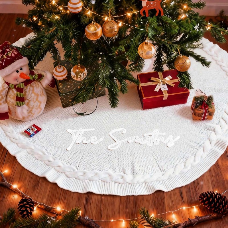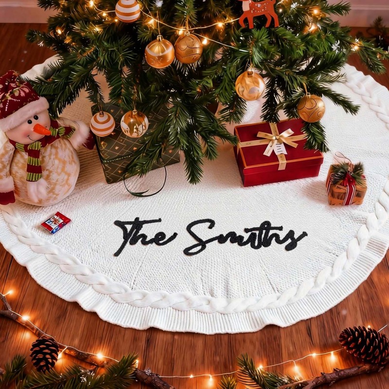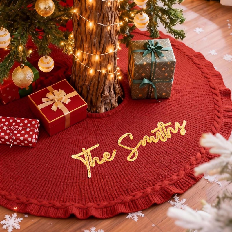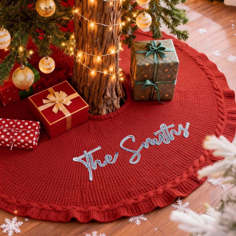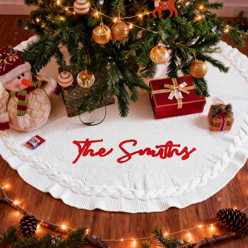 Celebrate the season with our Custom Name Christmas Tree Skirt. This cozy, knitted tree skirt is designed to wrap your Christmas tree in warmth and personal charm. Made from soft, yarn-knit fabric, it doubles as a snug blanket for chilly winter evenings and a festive centerpiece for family gatherings. Personalize the skirt with a name in your choice of color, and choose from classic red or white to perfectly match your holiday decor. Available in three diameter options to fit any tree: 62 cm, 92 cm, and 122 cm. Make your home feel truly special with a one-of-a-kind Christmas keepsake gift.