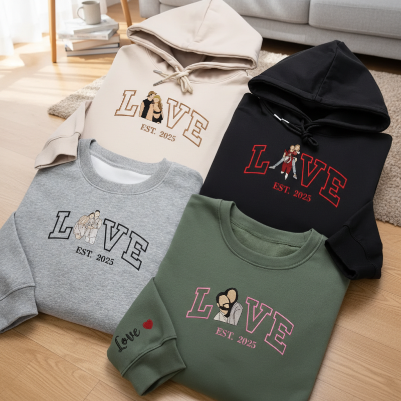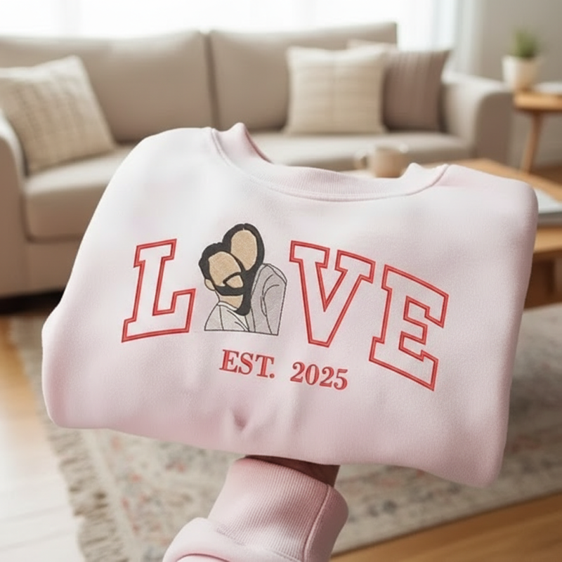 Celebrate your love in a cozy and meaningful way with this Personalized Embroidered Photo Couple Sweatshirt/Hoodie. Featuring a custom-embroidered photo design, this piece allows you to add a special “LOVE Est. Year” along with personalized text on the sleeve, making it a truly one-of-a-kind keepsake.