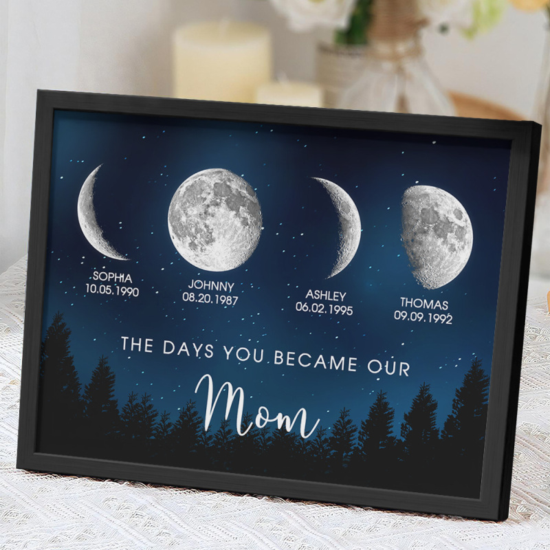 Each child’s name, birthdate, and unique moon phase are beautifully displayed, creating a one-of-a-kind celestial keepsake that honors the special moments that made her a mother.