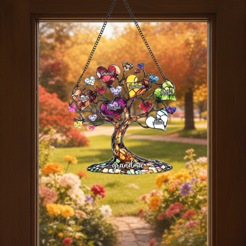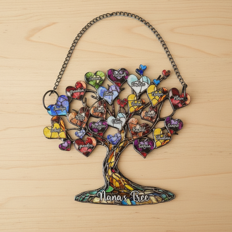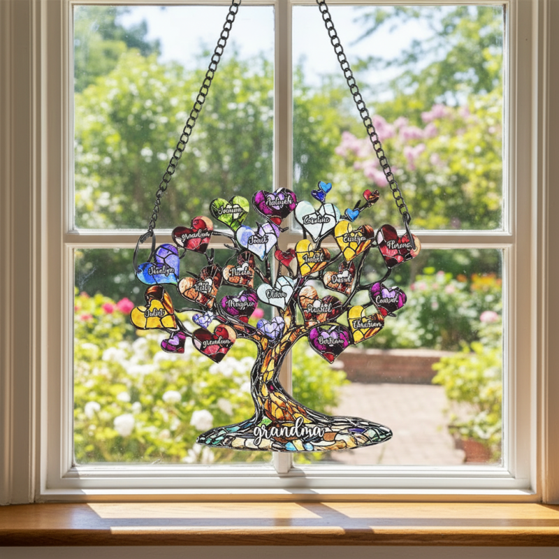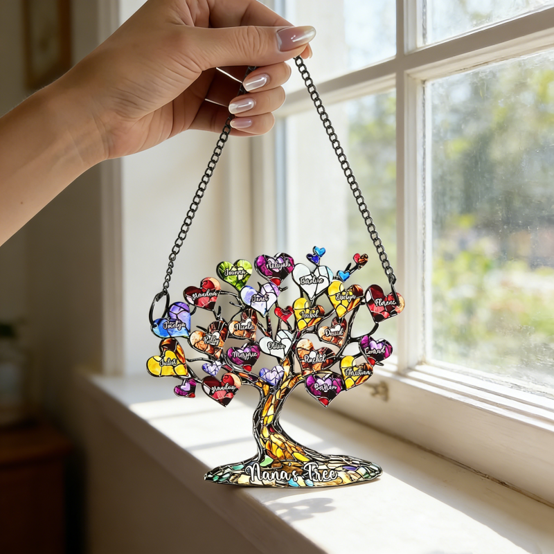 Celebrate your family bond with this stunning personalized family tree heart acrylic ornament! Designed in a vibrant stained-glass style, this suncatcher features a beautiful tree of life adorned with colorful heart-shaped leaves, each customizable with up to 20 family members' names, plus a special text (like "grandma") at the base. Crafted from durable acrylic, it hangs beautifully in windows, porches, or walls, casting gorgeous light and displaying your family story. A heartfelt, personalized keepsake, perfect for Mother’s Day, birthdays, or as a sentimental gift for mom, grandma, or any loved one.