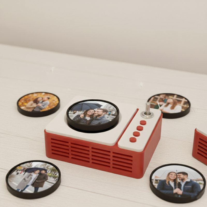 The player is available in four elegant colors: Red, Blue, Black, and White, making it a stylish and heartfelt decoration as well as a unique gift.