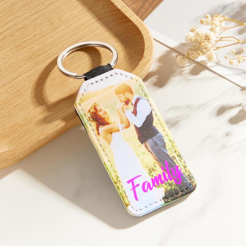 Personalize your own Family custom vegan PU leather photo keychains as the perfect bespoke accessory or thoughtful gift today! All of our custom PU leather photo keychains are made with 2 pieces of high quality, 100% vegan, PU leather which makes them very durable. We offer super-fast same-day shipping. All designs feature a choice of wonderfully colored and creative words designed to accent and fully personalize your favorite uploaded photo! Our custom photo keychains are guaranteed to add a touch of style to any key ring, purse, or backpack. They also work wonderfully as a tasteful zipper pull. Show off your favorite wedding photo, pet portrait, loved one, or funny picture. They also make the perfect conversation starter, our keychains are a great accessory to add a little thoughtful flare to your wedding favors, Holiday gifts, birthday celebrations, anniversaries, and any other special occasion or just a little something special for yourself or a friend. In addition, our custom photo keychains are perfect for everyday use, make fantastic bridesmaid gifts, wedding gifts, thank you gifts, holiday gifts, secret Santa, Cosplay, costume design, or add a custom business logos or photos as they make a great corporate gift for your employees or business partners as well.