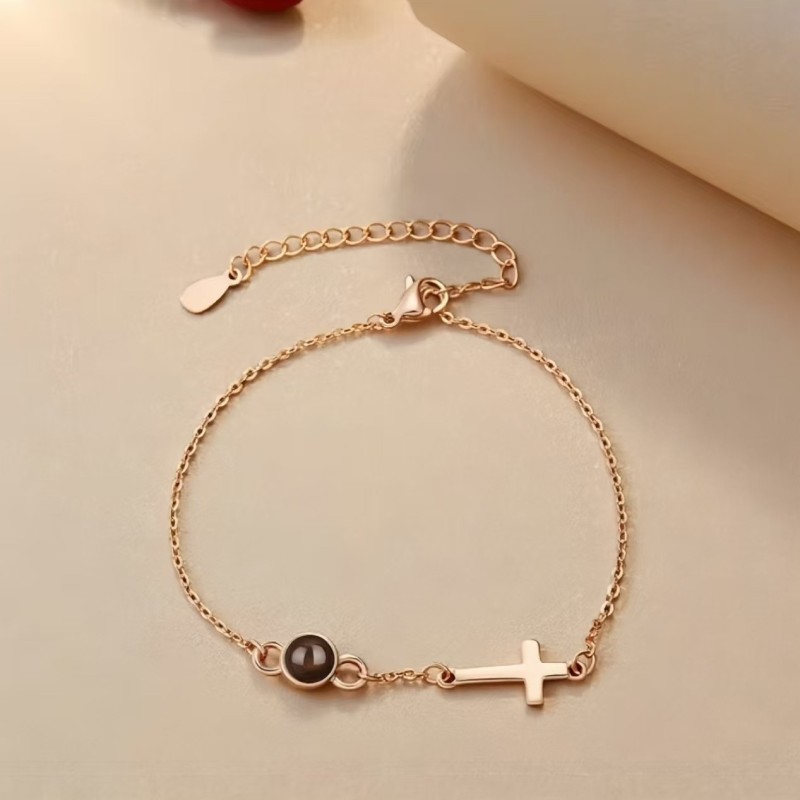 The Personalized Photo Projection Bracelet is a unique and meaningful piece of jewelry that combines spirituality with personal sentiment. Crafted with care, this bracelet features a delicate cross charm, symbolizing faith and blessing, which is elegantly attached to a fine chain.