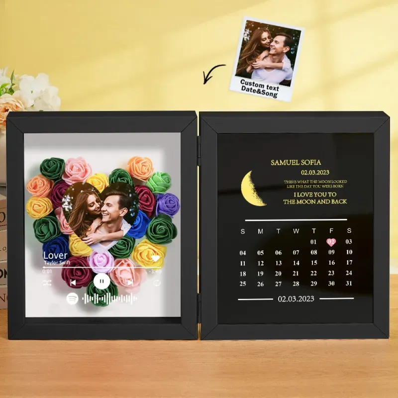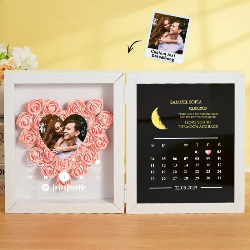 Introducing our Custom Music Flowers Shadow Box with Real Moon Phase Anniversary Calendar-a breathtaking fusion of handmade floral art, celestial romance, and personalized melody. This unique frame allows you to forever capture the moon from a special night-your first kiss, proposal, wedding, or any unforgettable moment-along with a song that tells your story.