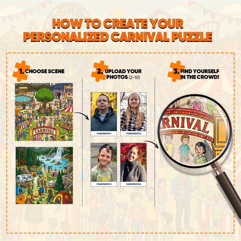Step into a lively illustrated world with this Personalized Wimmelbilder Puzzle, a fun and heartwarming way to turn your photo into an interactive cartoon crowd scene. Inspired by classic “find yourself” Wimmelbilder puzzles, this design transforms real people into charming cartoon characters hidden among joyful moments — inviting you and your loved ones to search, discover, and smile together.
