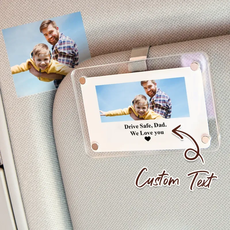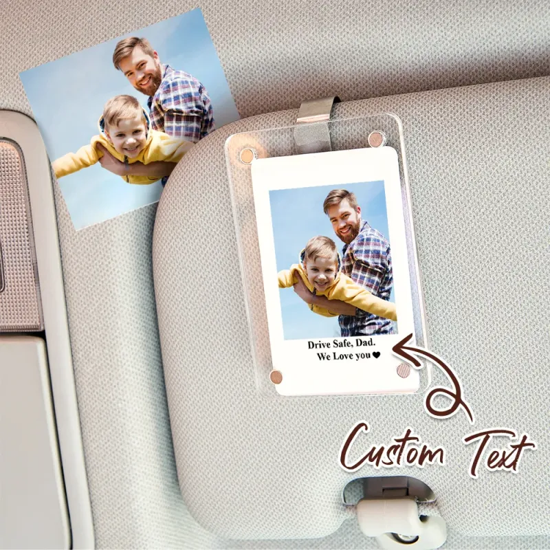 Frame measures 2.36 x 3.54 inches **You will receive an EMPTY frame with a visor clip adhered to the back - no photo is included** Slide the two magnetic pieces apart and add your own photo! Perfect size for displaying your favorite instant photos