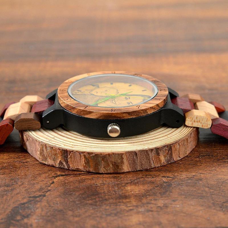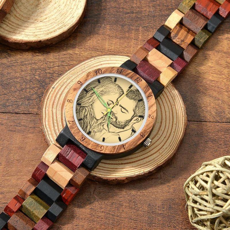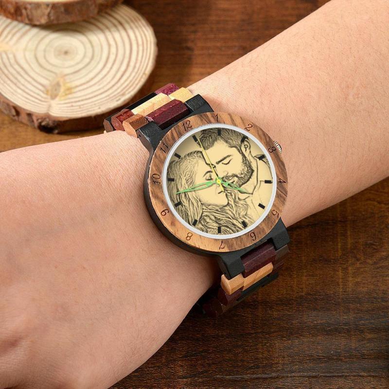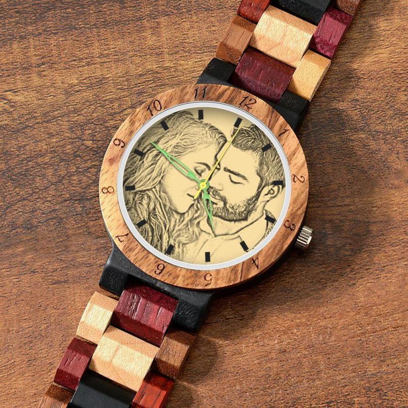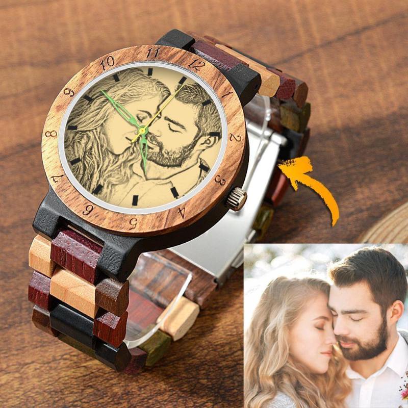 Photo Engraved Wooden, Photo Watch Wooden Strap 45mm Sketch Effect Colorful Wood for Men's