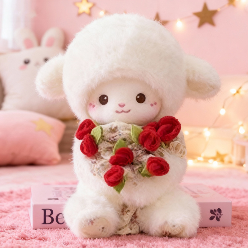 Bring charm and warmth to any room with this Plush Lamb Doll with Rose Bouquet. This adorable soft lamb wears a cute hat adorned with a delicate circle of roses. The hat is removable, allowing you to place it in the lamb’s arms to create a beautiful rose bouquet-a playful and heartwarming surprise.