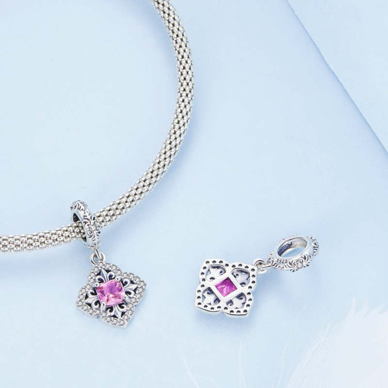 Retro Pattern with Pink Zircon Dangle Charm Silver