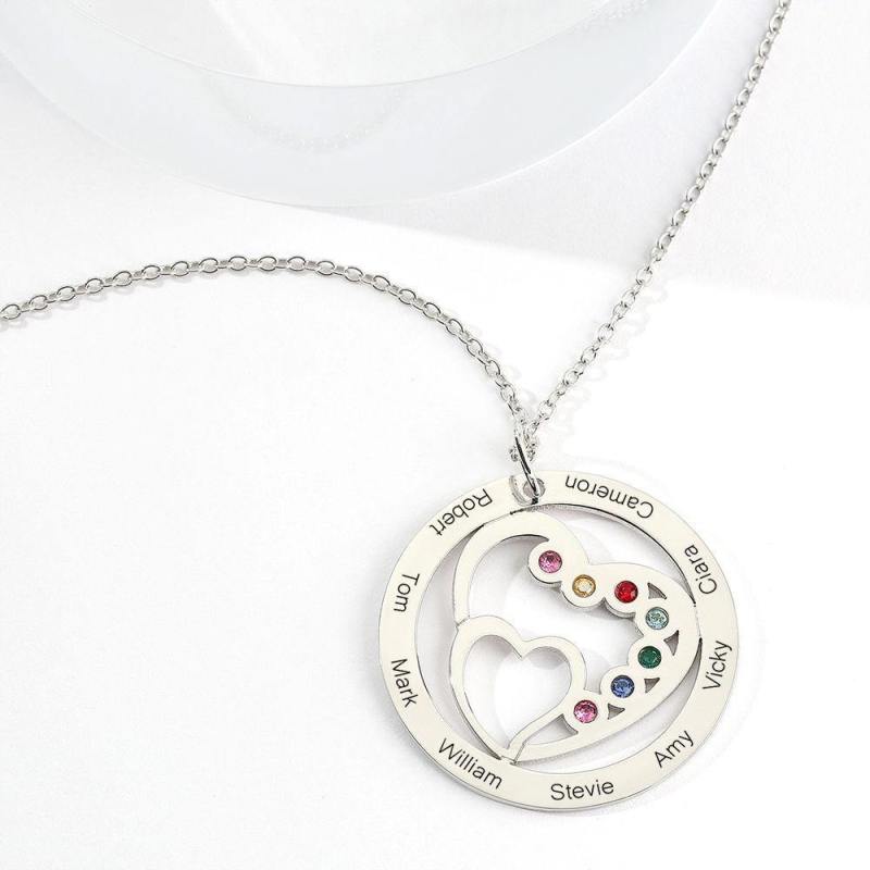 Round and Heart Engraved Necklace Silver with Custom Birthstone