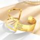 The unique qualities of this geometric cuff bracelet put a modern twist on a truly inspirational phrase. Let your inner fires blaze and shine with the confidence that you get from showing off your own personal style. This cuff has an open design that easily fits most wrist sizes. The design features small text, perfect for personal moments of reflection.